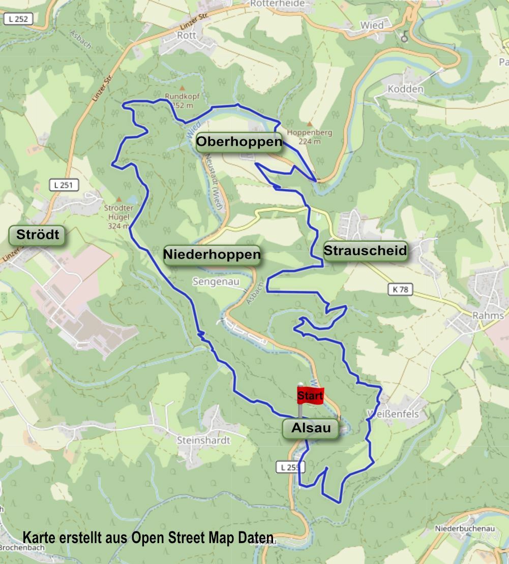 Zwischen Strauscheid und Oberhoppen wandern wir leicht bergab, queren schließlich die Wied über die nach der Flut erneuerte Brücke, und nach einer Passage entlang des Flusses beginnt ein langer Anstieg über breite Waldwege auf den Strödter Hügel. Wir erleben einen reizvollen Wechsel von Wald und Wiesen-Idyll, dann beginnt der steile Abstieg (Stöcke empfehlenswert!) ins Anxbachtal. Hier wandern wir gemächlich talauswärts und treffen auf historische Überreste vergangener Tage, das Pochwerk im Bremelsberg (um 1700), eine seit 1500 gebräuchliche Maschine zum Zerpochen von Erzen und Schlacken. Hinweistafeln liefern die nötigen Informationen. Der Anxbach bringt uns schließlich zurück nach Alsau zu unserem Ausgangspunkt. Hervorzuheben sind die schönen Pfade am Anfang und Ende der Tour, der Wiedweg mit seinen Graswegen, die Weissenfelser Ley und mehrere Aussichtsbänke und der Strödter Hügel mit seinen Blumenwiesen.