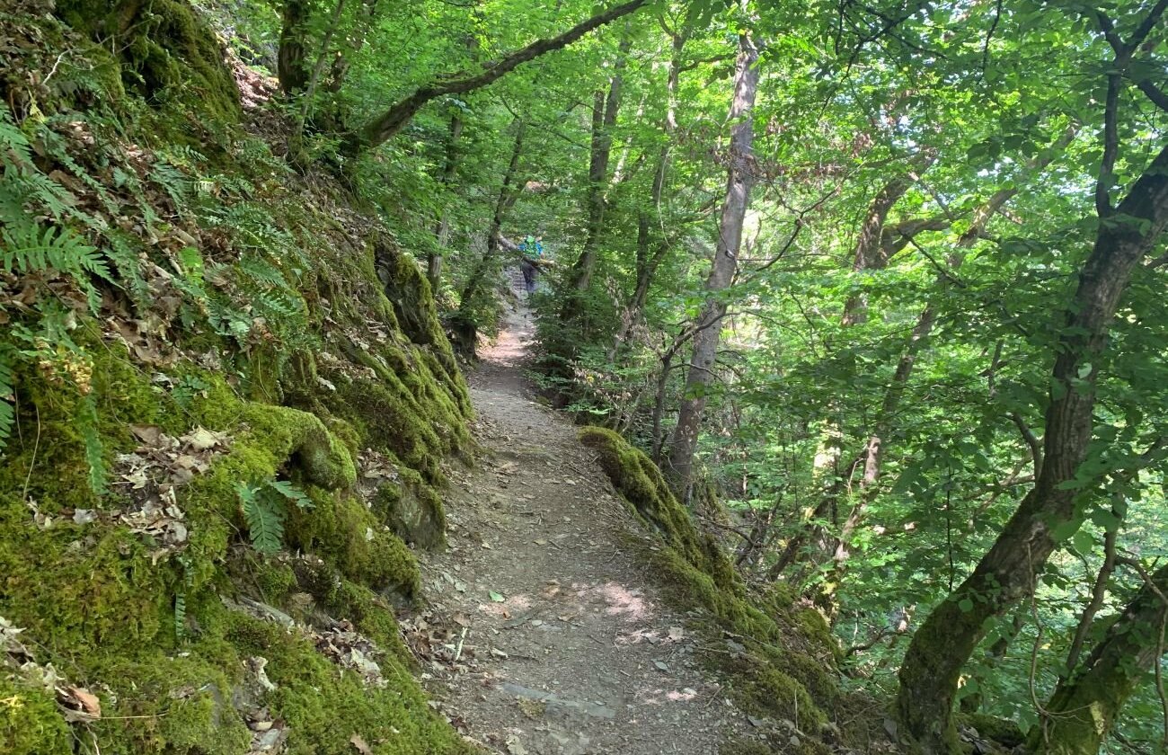 Einen ersten Höhepunkt erleben wir gleich zu Beginn, wenn wir nahe Klotten im Dortebachtal starten: Vorbei an einem Wasserfall und einigen schön gelegenen Bänken, geht es steil und stellenweise felsig und mit Seilsicherung aufwärts. Oben erreichen wir zwei herrliche Aussichtspunkte und kommen mal durch Wald, dann wieder durch Wiesen und Felder zum Achterknoten. Mit dem Moselsteig erreichen wir bald den Fellerbach und wandern durch dessen Tal nach oben. Wieder im Freien genießen wir längere Zeit in einer weiten Wiesenlandschaft herrliche Weitblicke. Dann steigen wir zum Pommerbach ab und gehen nun zum dritten Mal ein Bachtal aufwärts, diesmal begleitet von sonnigen Auen. Endpunkt dieses Abschnitts ist eine wunderschön gelegene Rasthütte und dazu ein versteckter Rastplatz an der Klosterruine Rosenthal.