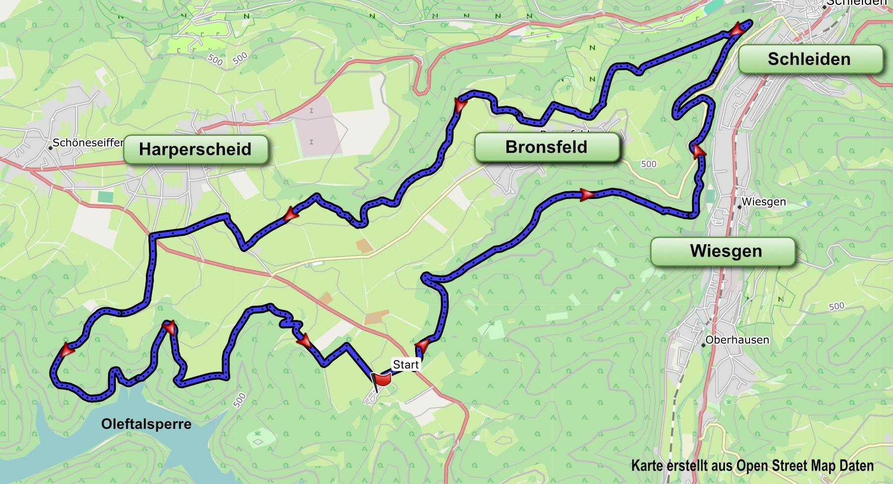 Eine Eifelwanderung entfaltet zu jeder Jahreszeit ihre eigenen Reize, das gilt auch für diese Tour; aber ein typischer Novembertag liefert sicherlich die passende Grundstimmung für die rauen Höhen oberhalb der Olefsperre. Rau und einsam beginnt unsere Runde: Vom Parkplatz am Hellenthaler Wildgehege kommen wir schnell in das Tal des Hellesbachs, das wir durch Wald längere Zeit in Richtung Olef abwärts wandern. Weiter geht es parallel zur Olef bei Schleiden mit einer besonders schönen Passage durch Hemlocktannen, später aufwärts und nördlich bei Bronsfeld ins Offene. Bei freier Sicht ins Dieffenbachtal steuern wir durch eine Streuobstwiese und ein kleines Biotop eine wunderschön gelegene Bank an.