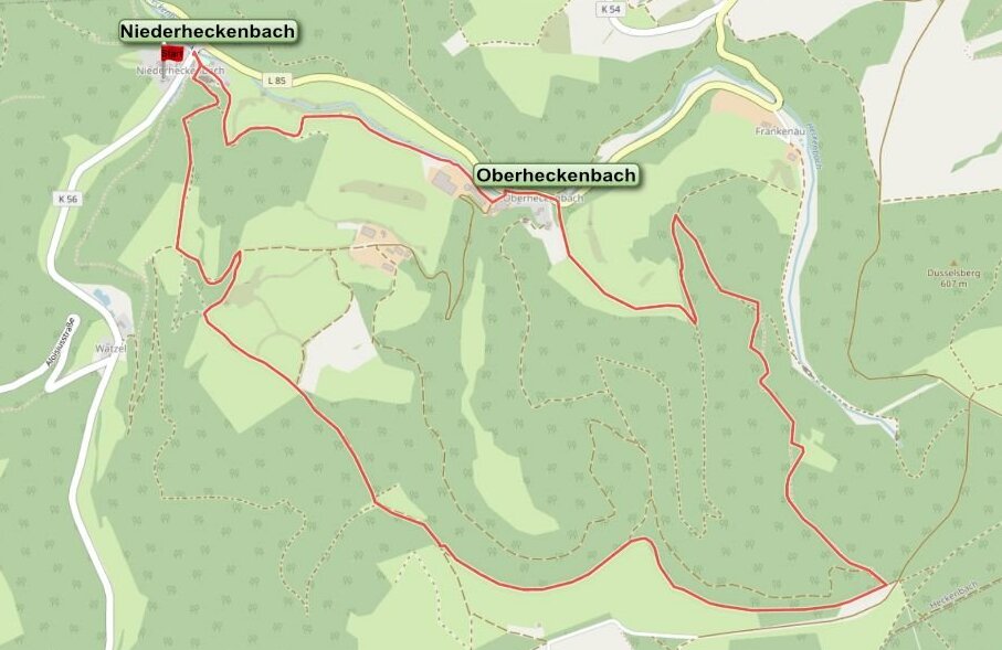 Besonders reizvoll ist der folgende Abschnitt, wenn wir nach den zum Teil unheimlichen Waldpassagen ins Offene kommen und durch eine Wiesenlandschaft abwärts nach Oberheckenbach laufen. Nach wenigen Metern auf der Straße biegen wir an einem Gehöft links ab.