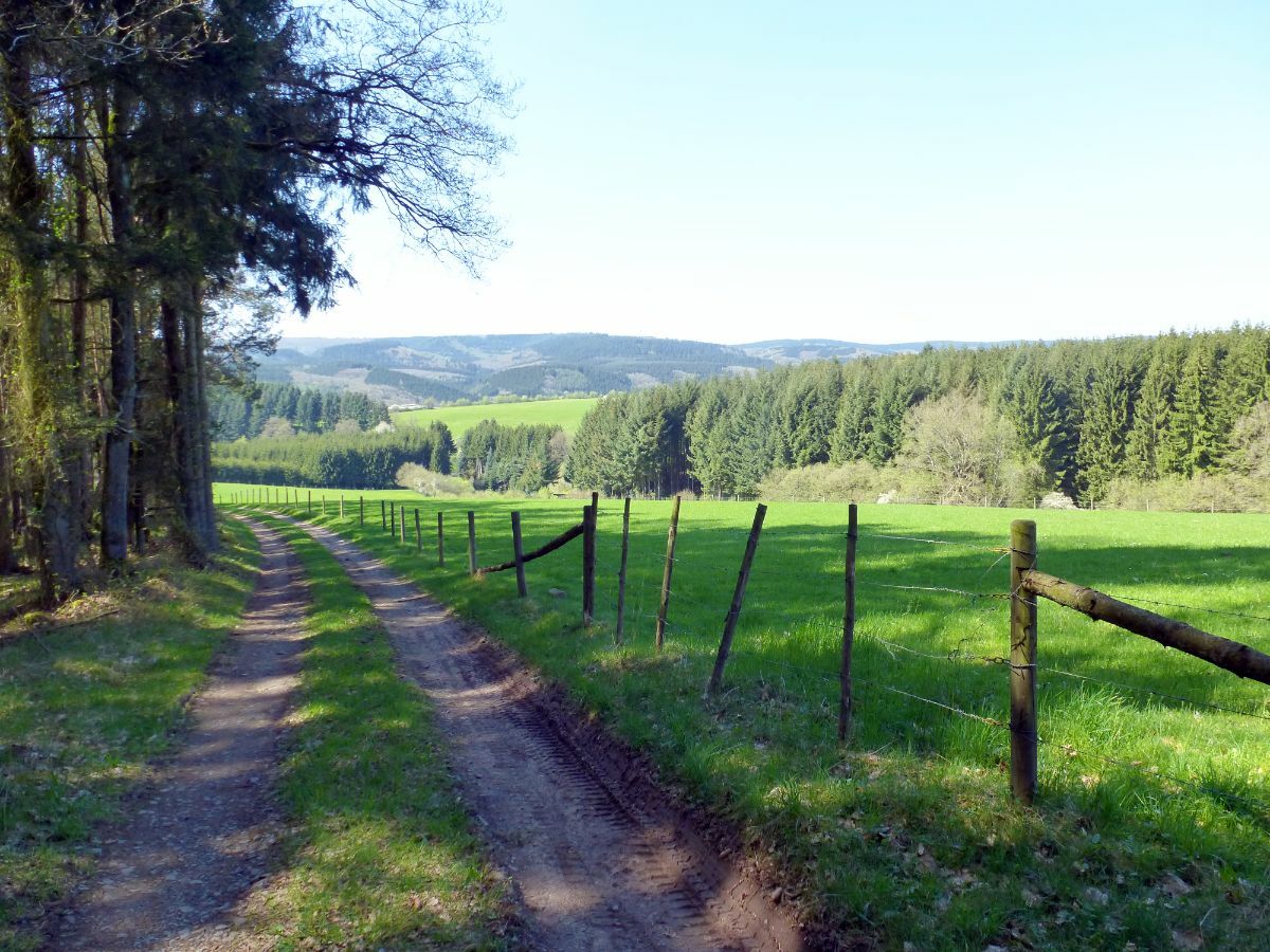 Der Blick öffnet sich, und bald wandern wir hoch über dem Ansbachtal durch eine arkadische Landschaft. Weiter geht es durch Wald zum Ansbach und an diesem eine Zeitlang aufwärts, vorbei an Fischteichen. Wenn wir den Bach verlassen haben, kommen wir bald ins Freie und erhalten zum ersten Mal weite Blicke auf eine ausgedehnte Wiesenlandschaft und die Wälder des Kylltals. Im weiteren Verlauf passieren wir ein Wegkreuz mit sehr schön gelegener Bank und folgen den Schildern zum Großen und Kleinen Noll sowie „Lindenhof“ und „Zendscheid“. Oben könnten wir einen kurzen Abstecher zum Kleinen Noll machen: Aussicht findet man dort keine, wohl aber eine einsame Wiese für die Picknickdecke.