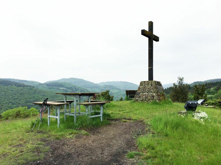 Im Herbst haben wir unseren Lesern die erste Etappe des neuen EifelNetteSteigs vorgestellt. Auch auf der zweiten Etappe erwarten uns herrliche Aussichtsplätze und Wacholderpassagen, diesmal aber auf der anderen Seite des Flusses. Wir treffen wiederholt auf Passagen der »Traumpfade«, und das bedeutet auch immer: gepflegte Wege, liebevoll platzierte Bänke und einladende Rasthütten. Wir wandern von der Wacholderhütte in Langscheid hinunter ins Tal, bleiben aber nur kurz am Fluss und steigen dann erst zur Falkenley, von dort weiter zur Hohen Rain auf, wo wir nach einer Ginster- und Wacholderpassage auf einen herrlichen Aussichtsplatz mit Rasthütte treffen. Auf dem Weiterweg empfiehlt sich ein kurzer Abstecher auf den Noorkopf, der schon aus der Entfernung mit seiner Panoramaschaukel lockt, ehe wir durch offene Wiesenlandschaft und vorbei an einer schönen Hütte nach Volkesfeld wandern. Direkt oberhalb des Ortes erwartet uns ein weiterer Höhepunkt, ein Wacholderhügel mit dem Riethelkreuz und einem Panorama-Rastplatz (Foto: NaturAktivErleben). Auf einem Höhenrücken setzen wir den Weg fort, bevor wir in weitem Bogen zum Waldsee von Rieden absteigen.