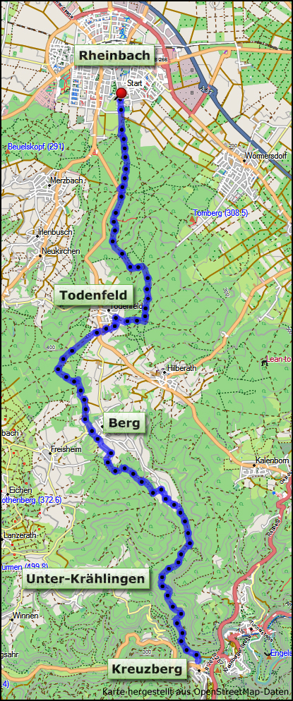 Und von dort geht es weiter auf schönen Wegen und ohne Verkehrslärm bis Todenfeld und Hilberath und hinunter ins Ahrtal. Das Wanderportal „NATUR AKTIV ERLEBEN“ hat diese Schönheiten voll ausgekostet und bietet nicht weniger als drei Touren an, die alle in Rheinbach starten. Eine davon, die durchs Vischeltal nach Kreuzberg führt, wollen wir Ihnen heute vorstellen. Es ist eine Streckenwanderung, und da stellt sich immer die Frage, wie man zurück zum Ausgangspunkt kommt. Zum Glück gibt es einen regen Busverkehr (im Sommer sogar noch durch einen Fahrradbus erweitert), der eine zügige Rückfahrt ohne Komplikationen ermöglicht. Vom Parkplatz erreichen wir schnell den Stadtwald und durchwandern gleich anfangs einen besonders reizvollen Abschnitt. Auf schmalem Pfad führt der Weg den mäandernden Hochbach entlang, an dem mehrere Teiche angelegt wurden. Das Ende dieser Passage markiert die Waldkapelle. Anschließend geht es auf wechselnd befestigten und unbefestigten Wegen überwiegend durch Wald in leichter Steigung bis auf die Höhe von Todenfeld. Diese Höhe queren wir bei weiten Blicken auf einem Wiesenweg, kommen anschließend wieder in den Wald und durchqueren den Höhenort Berg. Von dort führt unser Weg zunächst auf einem Asphaltsträßchen zum Naturfreundehaus, dann steigen wir auf idyllischem Pfad hinunter zum Vischelbach, bleiben kurze Zeit in diesem Tal und verlassen es dann wieder. Bald passieren wir Schloss Vischel (schöne Blicke zurück auf die Höhe zwischen Todenfeld und Hilberath), dann bringt uns eine ehrwürdige Allee zurück ins Tal des Vischelbachs. Wir wandern erst dicht am Bach durch dunklen Wald, später in offenem Gelände und landen am Ausgang des Tales an der Ahr in Kreuzberg.