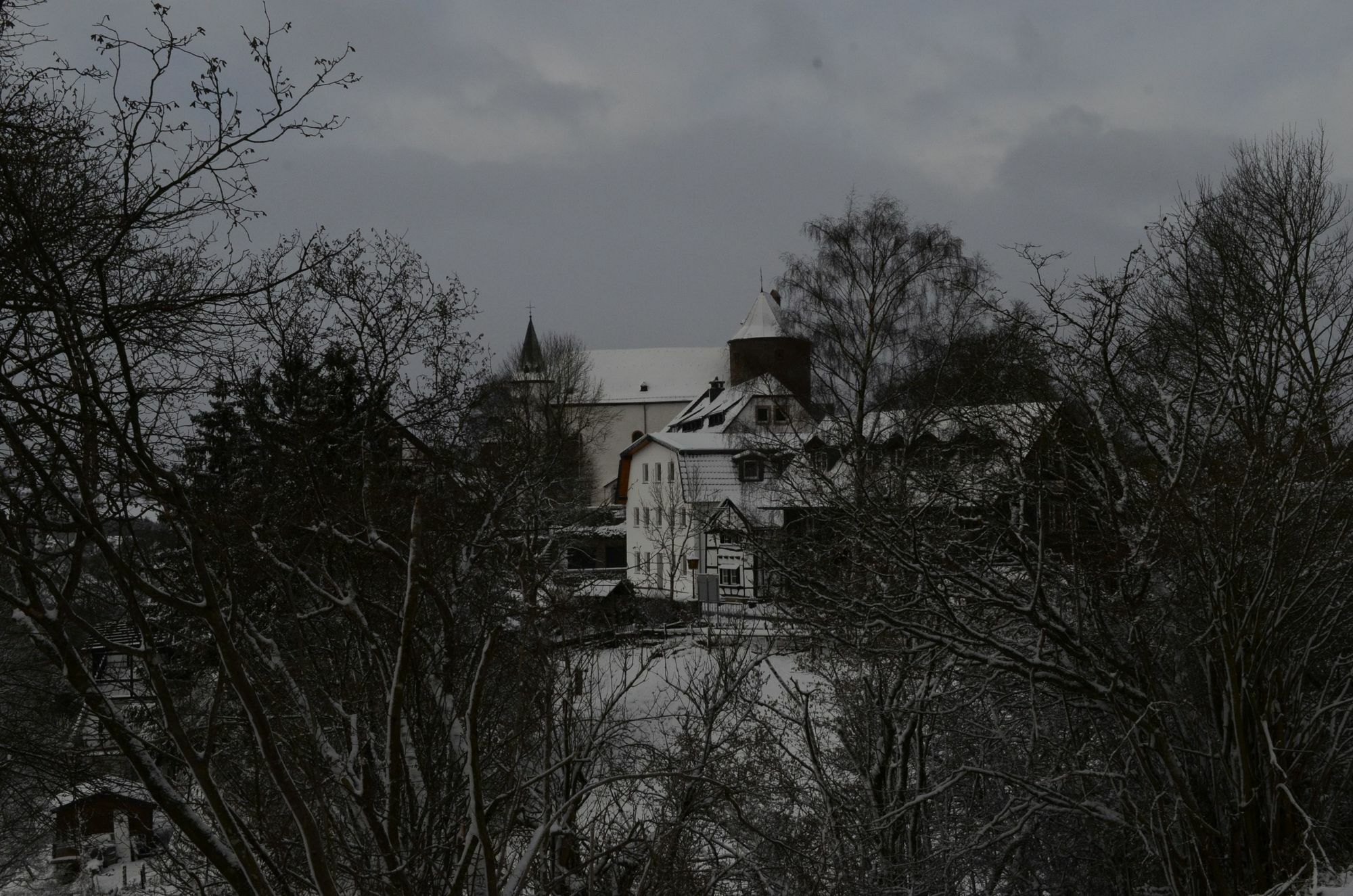 Wir steigen vom Parkplatz auf dem romantischen Pfad »Burgenroute« hinunter in das liebliche Tal des Manscheider Bachs, und mit einem Traumblick auf die Wildenburg beginnt die Wanderung durch Weiden, Wiesen und kurze Waldstücke: erst – tolle »Rückschau« auf die Burg! - hoch nach Kreuzberg, dann bei herrlicher Sicht nach Unterschömbach. Ein offener Höhenweg (die fernen Windräder stören hier etwas die Wanderburschen-Gefühle) führt in den Weiler Kradenhövel und hinunter zum Wolfertsbach. Dessen Tal folgen wir bis Wiesen, wo der zweite Aufstieg beginnt, auch dieser in freundlicher Steigung. Erst durch Wald, dann durch eine wellige Graslandschaft wandern wir aufwärts bis Zingscheid. Am Ortsende - dort auch ein Rastplatz – erhalten wir einen herrlichen Blick hinunter auf die Burg Reifferscheid.