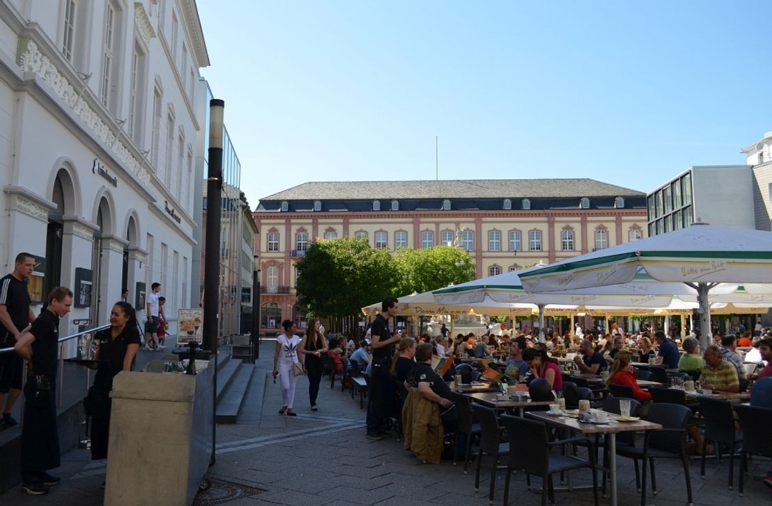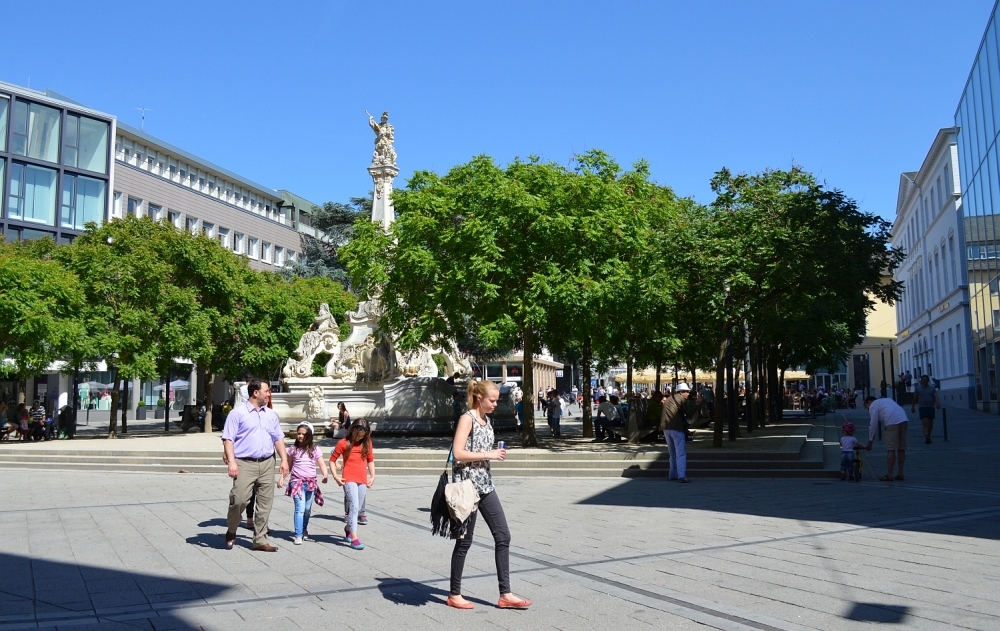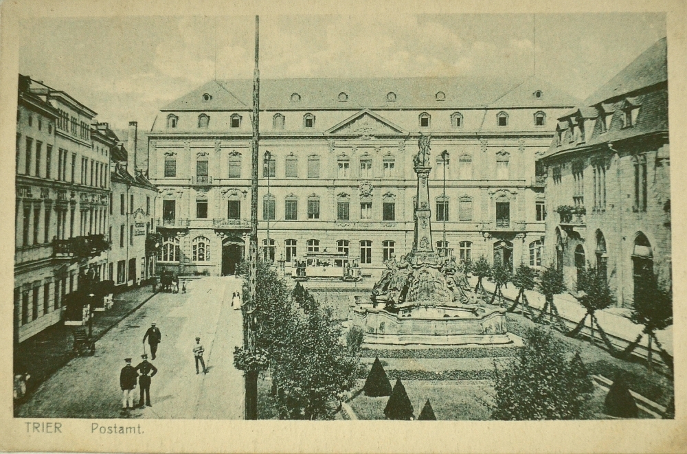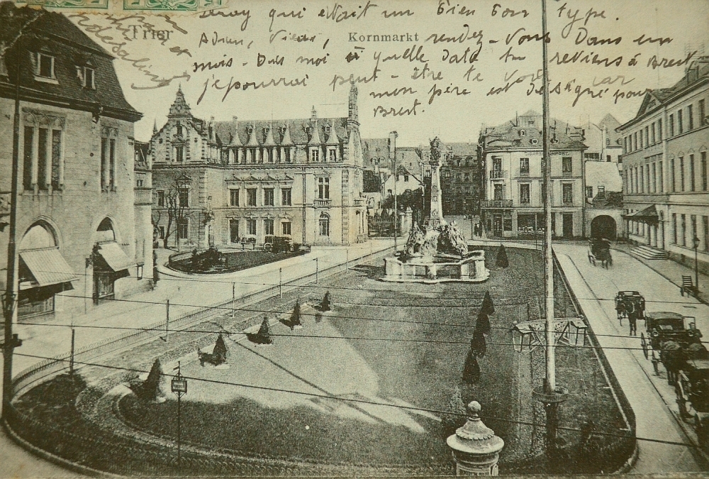 Auf den historischen Ansichten fällt wie in unseren Tagen zunächst die verspielte Rokoko-Pracht des von Johannes Seiz entworfenen Georgsbrunnens ins Auge. Vor 100 Jahren stand er allerdings noch in der Mitte des Platzes und war umgeben von einer 1907 angelegten Zierfläche mit Zaun und Formschnittbäumchen. Einige Jahrzehnte später musste diese adrette Anlage einem Parkplatz weichen. Und nach den Kriegszerstörungen wurde dann der komplette Brunnen Richtung Fleischstraße versetzt, um noch mehr Parkraum zu schaffen. Altes Rathaus mit Steipen-Anklängen Das "alte" Rat- und Kaufhaus an der Ecke zur Fleischstraße besaß ein offenes Erdgeschoss mit Kaufhalle. Das "neue" Rathaus stand weiter östlich an der Ecke des Kornmarktes. Zwischen beiden gab es eine weitere Zierbepflanzung. Diese nördliche Seite des Platzes wurde im Krieg zerstört und später modern ergänzt. Die Fassaden der "Reichspost" (heute Posthof) und des Casino prägen dagegen auch heute noch das Gesicht des Kornmarktes. Die Trierer Straßenbahn oder gar Pferdekutschen sind in unserer Zeit allerdings aus dem Stadtbild verschwunden. Blickachse zur Basilika Stattdessen kann man heute vom ehemaligen Postgebäude aus quer über den Platz am Brunnen vorbei bis zur Basilika sehen ? eine Blickachse, die es vor 100 Jahren noch nicht gab. Denn die Konstantinstraße als Verlängerung der Johann-Philipp-Straße wurde erst 1943 als "Brandgasse" angelegt. Heute flitzen klatschnasse Kleinkinder übers Pflaster Heute ist der Kornmarkt ein bei Touristen wie Einheimischen beliebter Treffpunkt und einer der schönsten Plätze der Stadt. Dazu tragen neben dem heiteren Charakter und den Schatten spendenden Bäumen auch die großflächige Außengastronomie und vor allem der zweite mit der Neugestaltung 2003 angelegte ebenerdige Brunnen bei ? an warmen Tagen der beliebteste Trierer Treffpunkt für nicht wasserscheue (Klein-)Kinder. (cn, Fotos: Historische Postkarten / Neumann)
