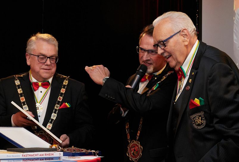 Die Zahl 11 hat für Karnevalisten eine besondere Bedeutung. 4 x 11 Jahre ist der Landesverband Rhein-Mosel-Lahn, Mitglied im Bund Deutscher Karneval e.V. nun alt geworden. Ein Jubiläum, das mit einer festlichen Gala im Kasino am Kornmarkt gefeiert wurde. Vor 120 geladenen Gästen, darunter als Vertreter der Stadt Oberbürgermeister Wolfram Leibe und Kulturdezernent Markus Nöhl, wurde der langjährige Präsident Peter Pries von seinem Nachfolger Andreas Noll zum Ehrenpräsidenten ernannt. Der gebürtige Norddeutsche prägte 50 Jahre den Trierer Karneval. Pries sei jemand, der Karneval auch in schwierigen Zeiten nach vorne gebracht habe, sagte der Oberbürgermeister in seinem Grußwort. Und bei schlimmen Ereignissen wie Corona, der Amokfahrt oder der von der Flutkatastrophe betroffene Stadtteil Ehrang, sei Karneval wichtiger als je zuvor. Leibe betonte die Bedeutung der Hintergrundarbeit, die der Verband leiste. „Diese Strukturen sind eminent wichtig. Jeder Karnevalist will auf der Bühne stehen, aber es braucht Menschen, die sich überzeugen lassen, diese Arbeit zu machen“, so Leibe. Unter den Ehrengästen war auch Klaus-Ludwig Fess, Präsident des Bundes Deutscher Karneval. „Gerade in diesen schwierigen Zeiten durften wir erfreuliche Zeichen und Aktionen echter Solidarität unserer Vereine und Verbände beobachten. Wir haben unseren Humor nicht verloren. Reißt die Menschen aus ihrem Alltag und zeigt ihnen, was Fastnacht, Traditionen und Brauchtum bedeuten“, gab er den Karnevalisten für die anstehende Session mit auf den Weg. Höhepunkt des Abends war schließlich die feierliche Ernennung von Peter Pries zum Ehrenpräsidenten. Der „Grandseigneur des Trierer Karnevals“, wie Präsident Andreas Noll ihn nannte, kam 1963 während seiner Bundeswehrzeit nach Trier. Der heute 78-Jährige entdeckte 1972 dann den Karneval für sich. Sitzungspräsident der Roten Funken oder Mitglied im Elferrat bei der KG Heuschreck sind nur einige Funktionen, die er im Lauf der Jahre ausübte. Vor 25 Jahren rief er die ATK Gala ins Leben. Dort wird jedes Jahr der Kaiser-Augustus-Orden an eine bekannte Persönlichkeit verliehen, die anschließend 5555,55 Euro für ein soziales Projekt ihrer Wahl erhält. Unter den Geehrten sind Namen wie Fritz Walter, Dieter Thomas Heck, Alfred Biolek oder Henry Maske. 2008 wurde er zum Präsidenten des Landesverbands Rhein-Mosel-Lahn gewählt, dem größten deutschen Karnevalsverband mit 103 Mitgliedern. Ganz im karnevalistischen Ruhestand ist er aber noch nicht. Aktuell ist Pries Vizepräsident des Landesverbands karnevalistischer Tanzsport Rheinland-Pfalz. Unter den ersten Gratulanten waren Dietmar Jerger (Präsident IG Mittelrheinischer Karneval), Heiko Rudolph (Präsident Karnevalverband Kurhessen) und Hans-Werner Strauß (Verband Saarländischer Karnevalsvereine). Neben Pries wurden die langjährigen Verbandsmitglieder Doris Köhl und Peter Peters zu Ehrenmitgliedern ernannt. Zu einer Karnevalsveranstaltung gehören natürlich auch Büttenreden. Und so sorgten die mehrfach ausgzeichneten Nachwuchsredner „Geschwister in der Bütt“ Lena und Niklas aus Aachen ebenso wie „Astronaut“ Andreas Jager von der KG Hau-Ruck Saarburg für beste Unterhaltung, ebenso wie die Band „Suredreams“ die den Abend musikalisch mitgestaltete. (mw)