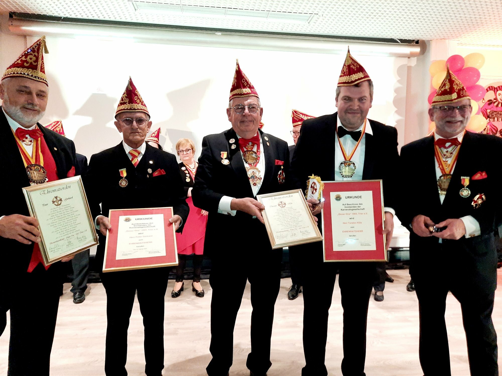 Neu aufgenommen in den Ehrenrat der KG Onner Ons wurden Peter Gerhard und Thorsten Kläs von Ehrenratspräsident Werner Dellwing und seinen Vizepräsidenten Adolf Hess jr. und Andreas Dalpke. Die traditionelle Saalspende für einen sozialen Zweck brachte an diesem Abend die stolze Summe von 2.200 Euro ein. Sitzungspräsident Joachim Wagner und das Trierer Stadtprinzenpaar Michael II. und Bianca I. überreichten Nestwärme Chefin Petra Moske die Spende noch auf dem Ordensfest.